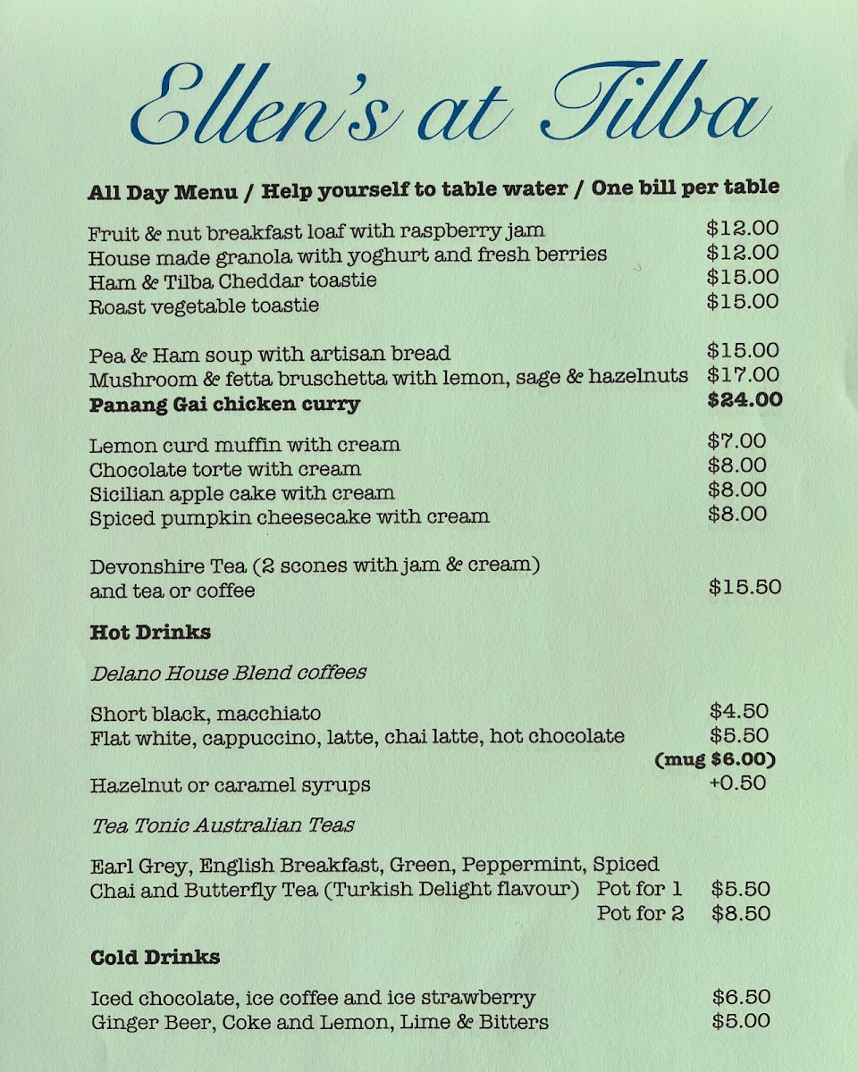 Ellens at Tilba (formerly Tilba Tea Pot) Menu